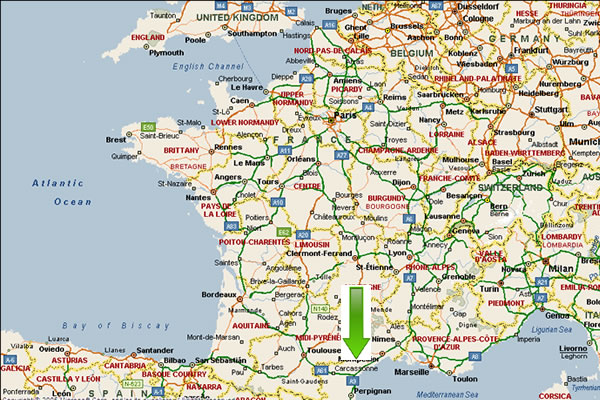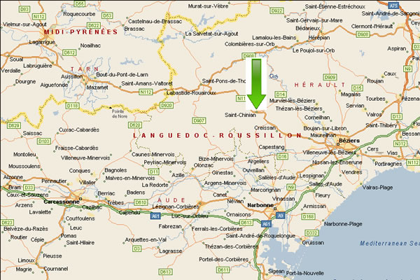 The area is well served by the budget airlines. There are flights from the UK to Beziers 25k (Ryanair from Stansted & Bristol), Montpellier 50k (Easyjet), Carcassonne 80k (Ryanair) and Toulouse 130k (Easyjet). You can also fly to Spain - Barcelona and Girona are both within a few hours drive of Saint-Chinian.